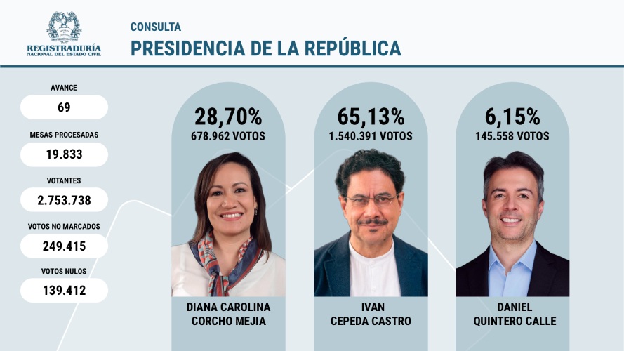 El total de votantes luego de 19.833 mesas procesadas es de 2.753.738 según el boletín 69 de la Registraduría; de los cuales 249.415 fueron votos no marcados y 139.412 los votos nulos.